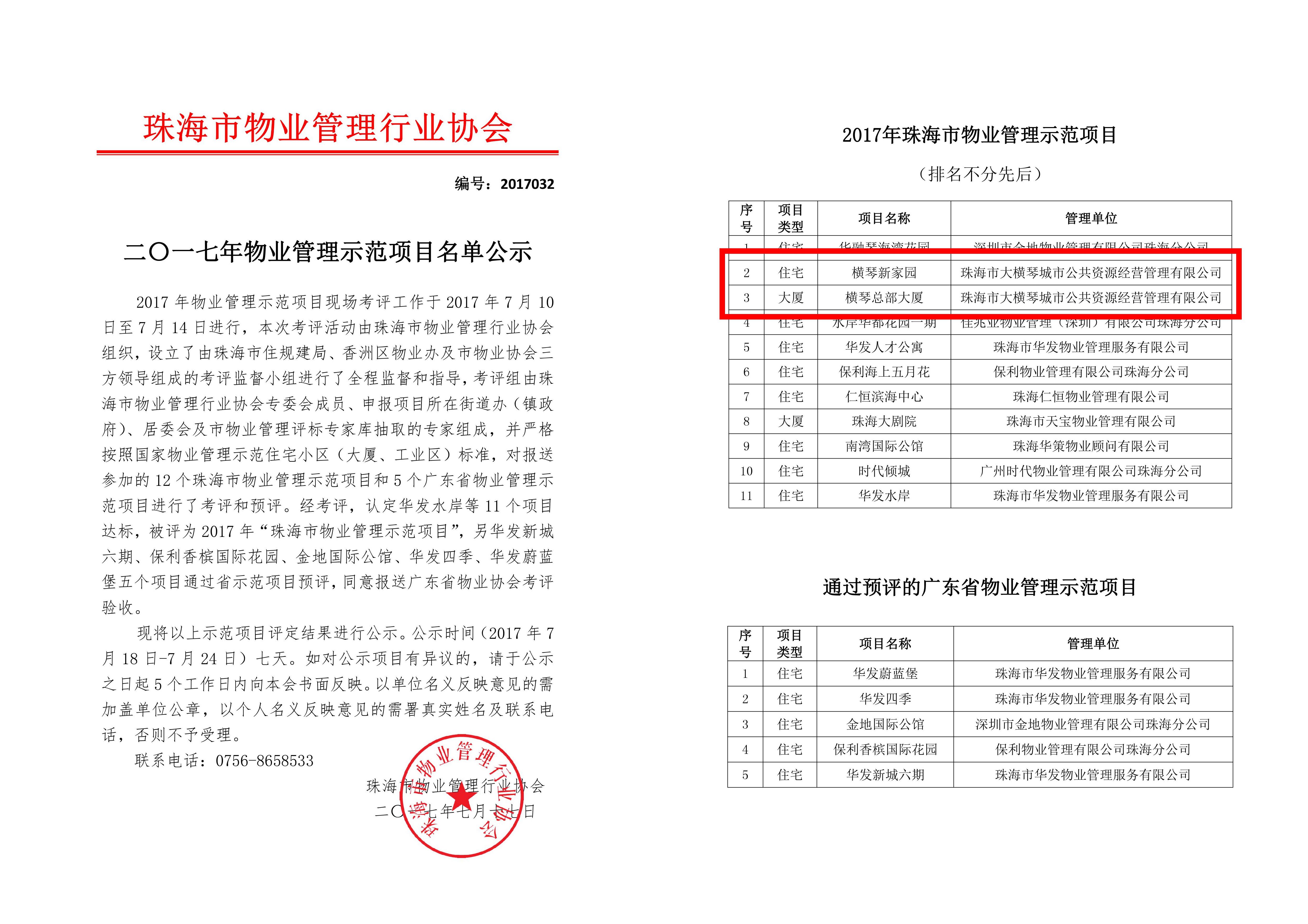 日前,珠海市物業管理行業協會發布了《關于2017年物業管理示范項目考評通報》,由我司提供物業服務的橫琴新家園、橫琴總部大廈兩個項目榜上有名。