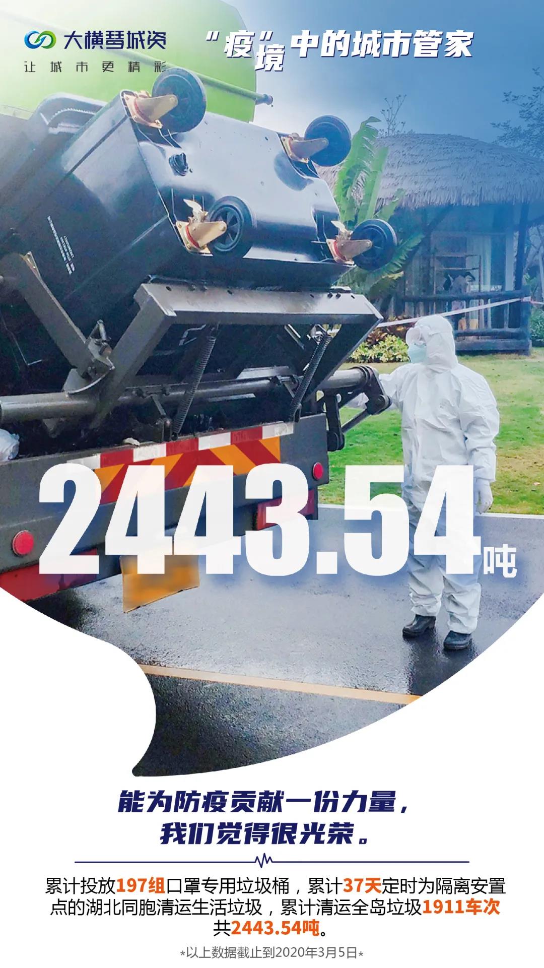 以口罩等防疫廢棄物收集運輸為例,大橫琴城資在服務的公共空間、物業項目等地全覆蓋投放廢棄口罩專用桶197組,并制定了嚴格的防疫廢棄物收運流程,安排專人專車定時定點收集湖北籍人士集中隔離醫學觀察點的生活垃圾,截至3月5日,累計安全清運集中隔離醫學觀察點生活垃圾達37天。