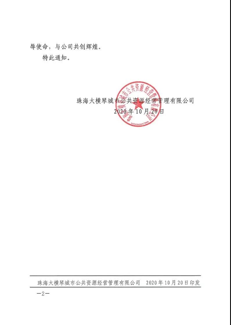 大橫琴城資為容杰斌頒發2020年度“十年服務獎”