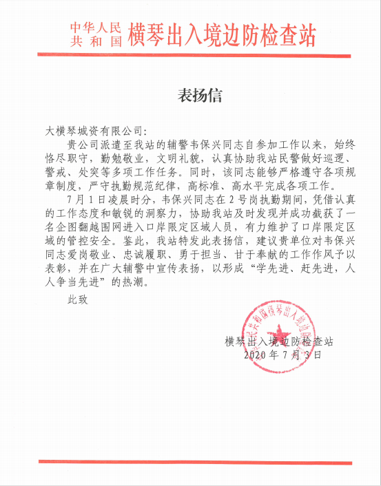 橫琴出入境邊防檢查站發(fā)來表揚信,對韋保興愛崗敬業(yè)、勇于擔當、甘于奉獻的工作作風提出表揚。