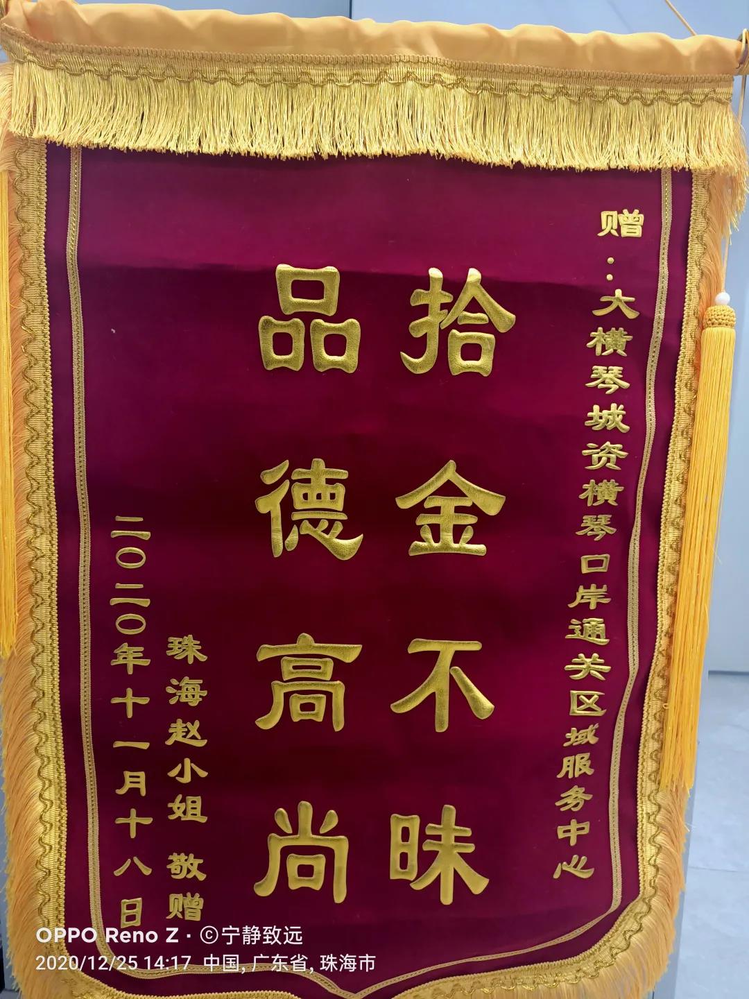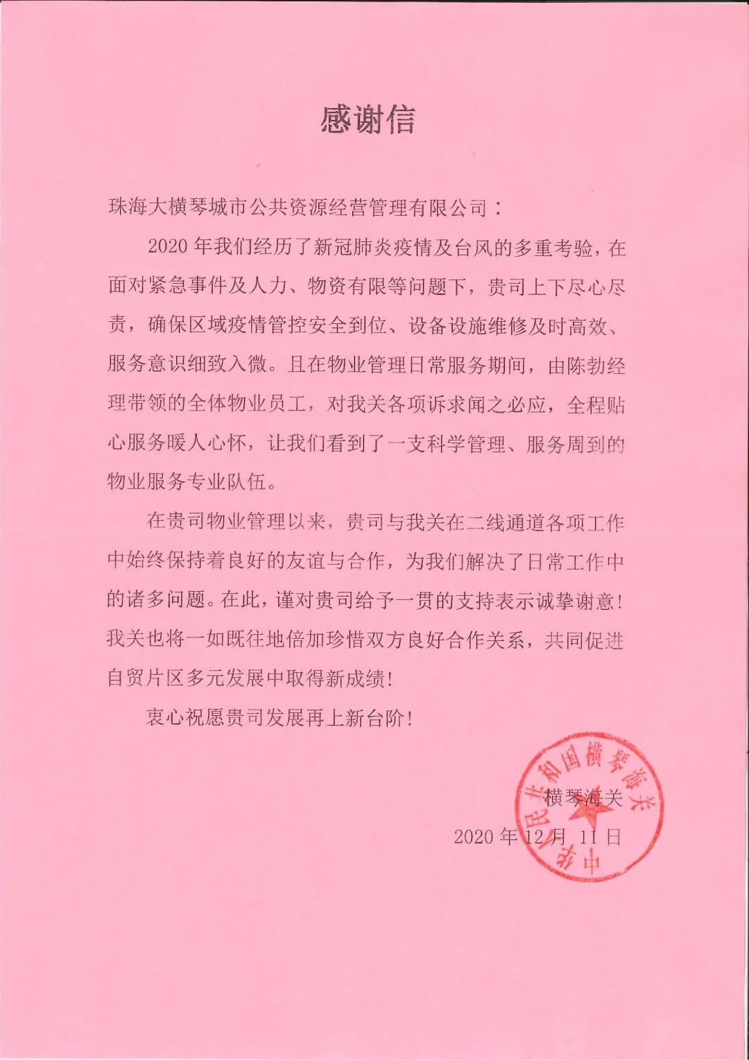 2020年12月,橫琴海關(guān)就優(yōu)質(zhì)的物業(yè)服務質(zhì)量贈與二線通道管理中心印有“精誠服務,情系海關(guān)”的錦旗一面及感謝信一封,以示感謝。