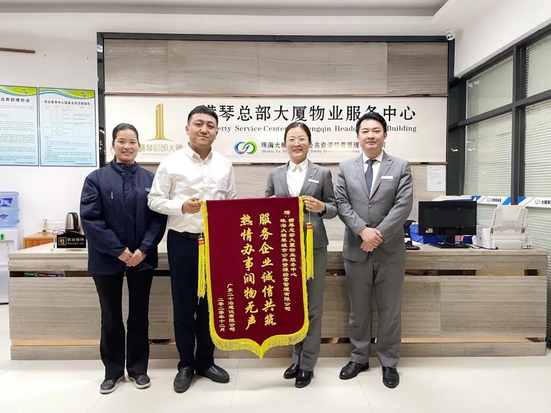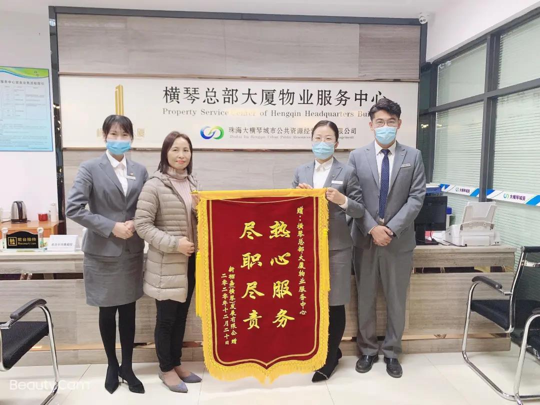 2020年12月,新栢嘉(橫琴)發(fā)展有限公司送來印有“熱心服務,盡職盡責”的錦旗與慰問品,感謝過去一年,橫琴總部大廈物業(yè)服務中心全體員工的盡心服務。