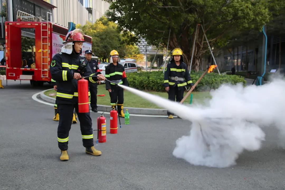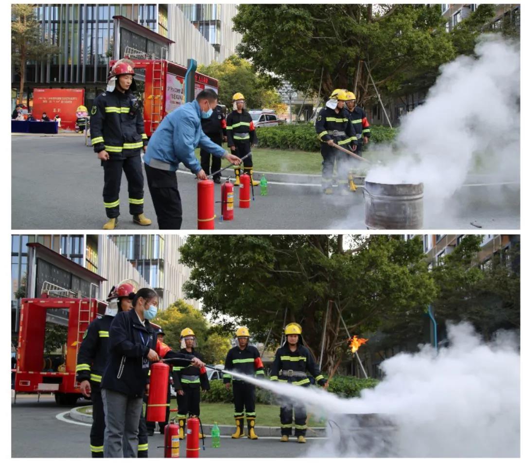 園區(qū)客戶、物業(yè)服務(wù)中心員工現(xiàn)場嘗試使用滅火器滅火