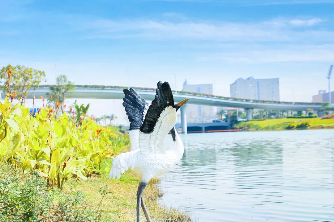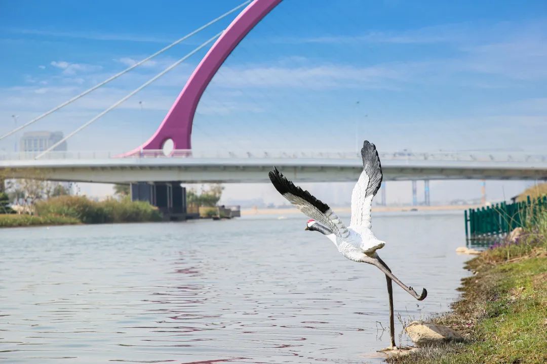 河岸上的丹頂鶴雕塑焦急地“俯身”