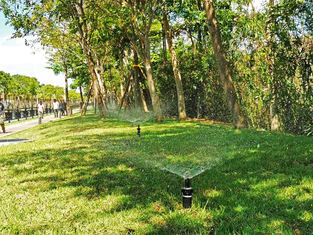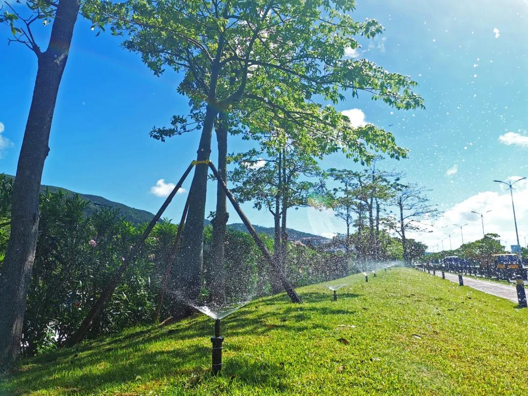 ▲在大面積的綠化帶上,雨鳥噴淋頭進行360度噴灑,確保苗木“喝飽水”。