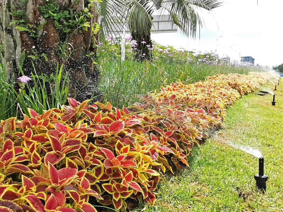 “相比傳統的灑水車直噴式灑水,使用噴淋系統,一是沖擊力小,對花卉綠植的損傷較小,也保護了草皮里的泥土,不易沖刷到外面;二是長時間地細致噴灑,在達到良好的綠化養護效果的同時,也起到了降塵、凈化空氣的作用;三是采用網格化的管理方法,每隔1公里左右便設一個總開關,由工作人員定時、定點開啟,集中噴灑,可有效提升工作效率。”大橫琴城資市政管理事業部的工作人員介紹。