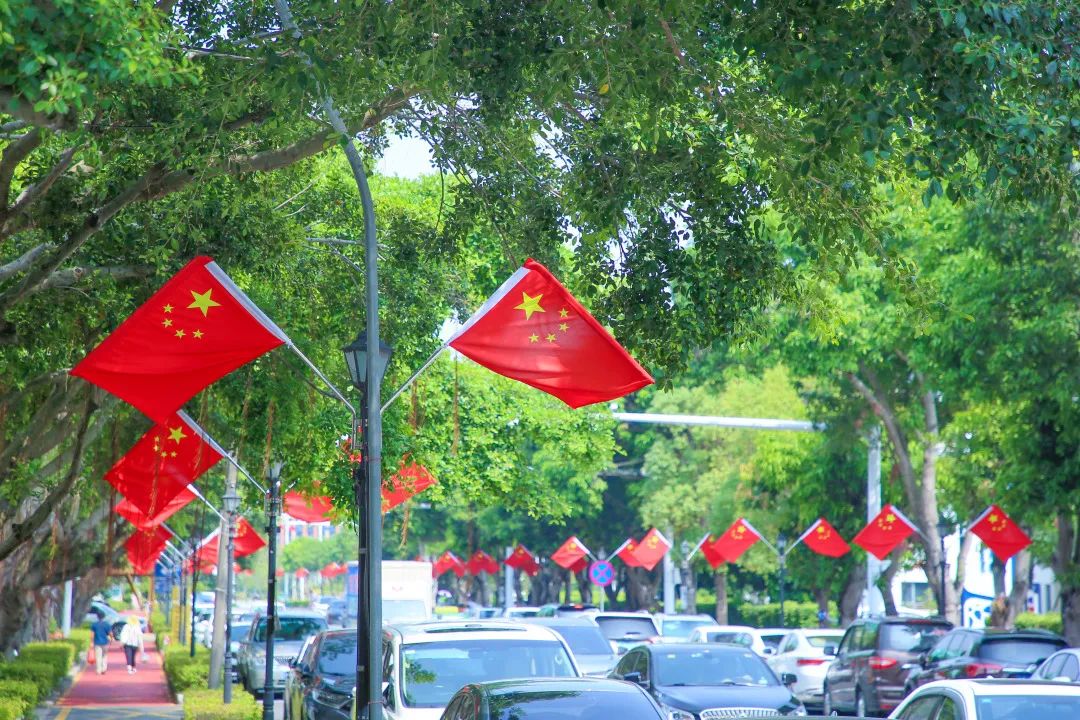 橫琴大橋、寶興路、環(huán)島東路、長隆大道(長隆段)……在橫琴的各個(gè)主干道路,一面面五星紅旗整齊劃一,一眼望去儼然是紅色的海洋,在綠樹藍(lán)天的映襯下,格外艷麗奪目。