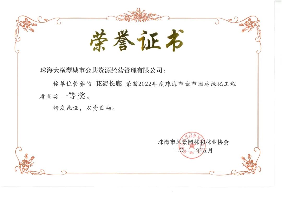 近日傳來喜訊,由大橫琴城資管養(yǎng)的橫琴花海長廊榮獲由珠海市風(fēng)景園林和林業(yè)協(xié)會(huì)頒發(fā)的2022年度珠海市城市園林綠化工程質(zhì)量獎(jiǎng)一等獎(jiǎng)。