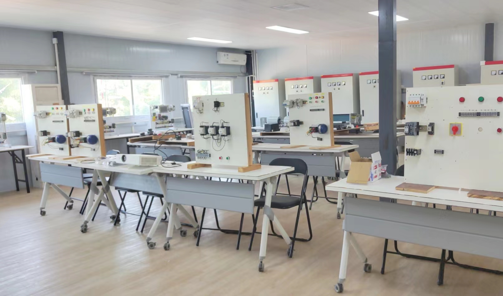 培訓室內配套設置了4臺PLC教學版智能自動控制模板、4臺成品動力柜、4臺成品照明柜、4套直流電機調速控制線路、5套三相電機正反轉接線設備、5套三相水泵浮球控制設備及各種適用于初級、中級機電認證高端設備。未來,該培訓室將開放給公司機電業務線條員工日常訓練使用,有助于員工培養“執著專注、精益求精、追求進步”的工匠精神。