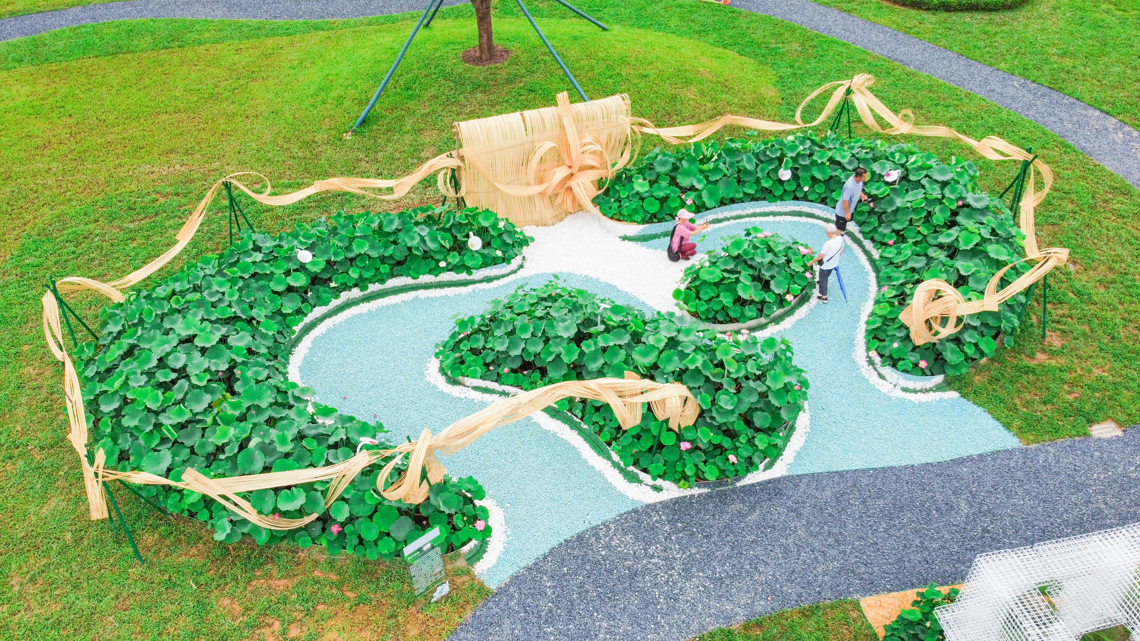 在“荷夢瀲滟”展園內,四周環繞著的竹編以流水、瀑布為造型,其自然的流動感與荷花的靜謐感相輔相成,融合成獨特的東方美感,在形成生態圍擋的同時,也為展園增添了幾分詩意。