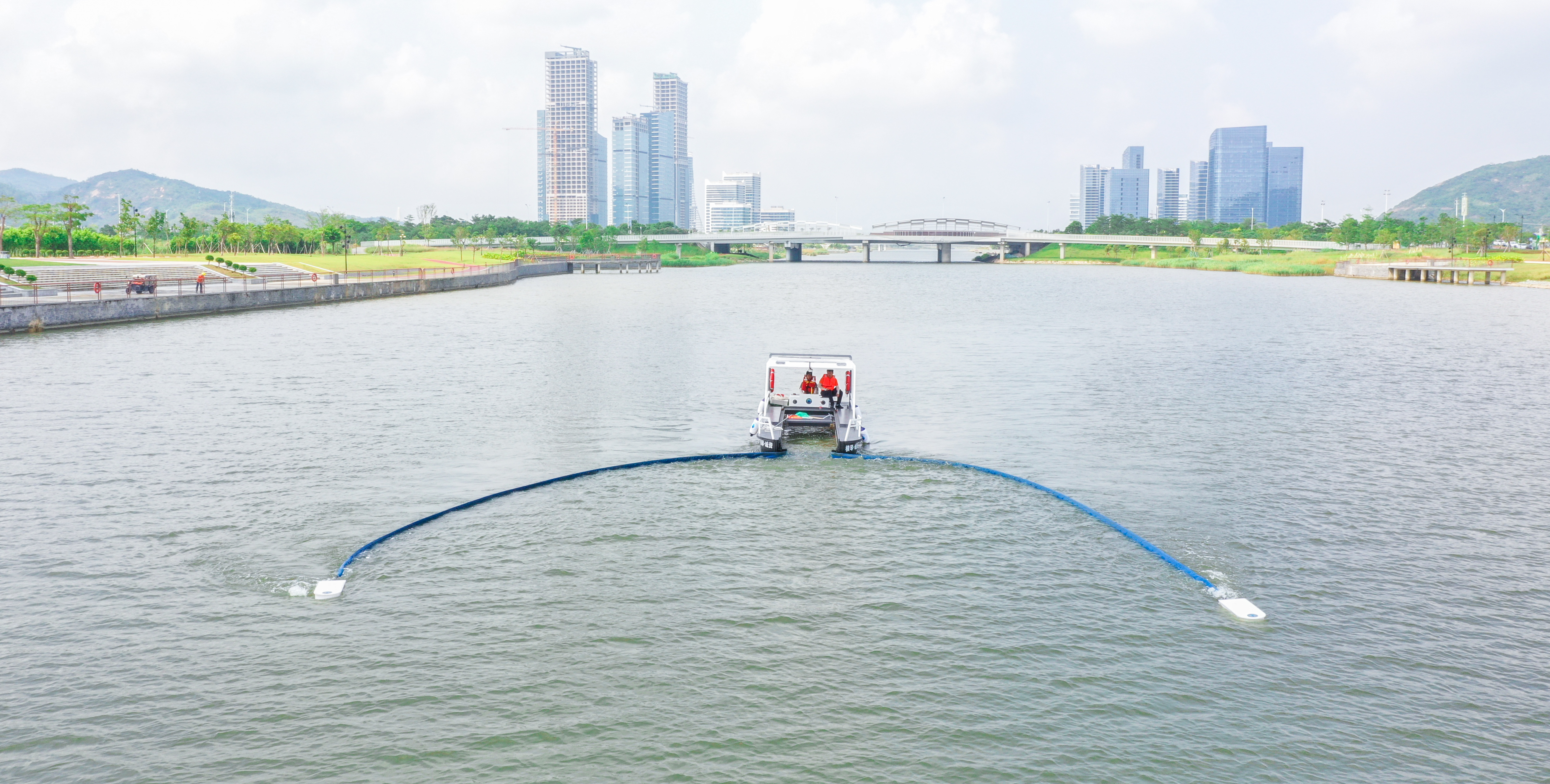 工欲善其事,必先利其器。大橫琴城資引進河道清污利器——“智能水面清理長臂船”。該長臂船展臂的收集寬度為2-30米,每小時可覆蓋10萬平方米的水域面積,僅需一名駕駛員操作,約6小時即可在天沐河完成一次全覆蓋保潔。