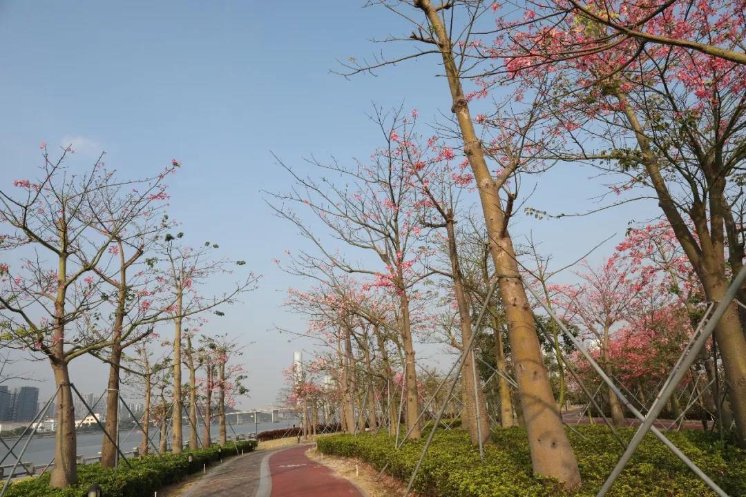 隨處可見的櫻花木棉在藍天下如織綻放